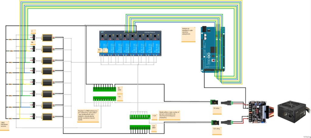 +5V je připojeno ke svorce C (Common) spínače. Zem je připojena ke svorce NC spínače přes 10K-Ohm pull-down rezistor . Svorka NC je také připojena ke vstupu Arduina. V tomto zapojení bude na vstupu Arduina logická 1 (HIGH), když spínač není stisknutý. To znamená, že elektromagnet (a tedy i jistič) je „vysunutý“. Když je spínač „zasunutý“, bude na odpovídajícím vstupu Arduina pro spínač logická 0. To vše 8krát 🙂